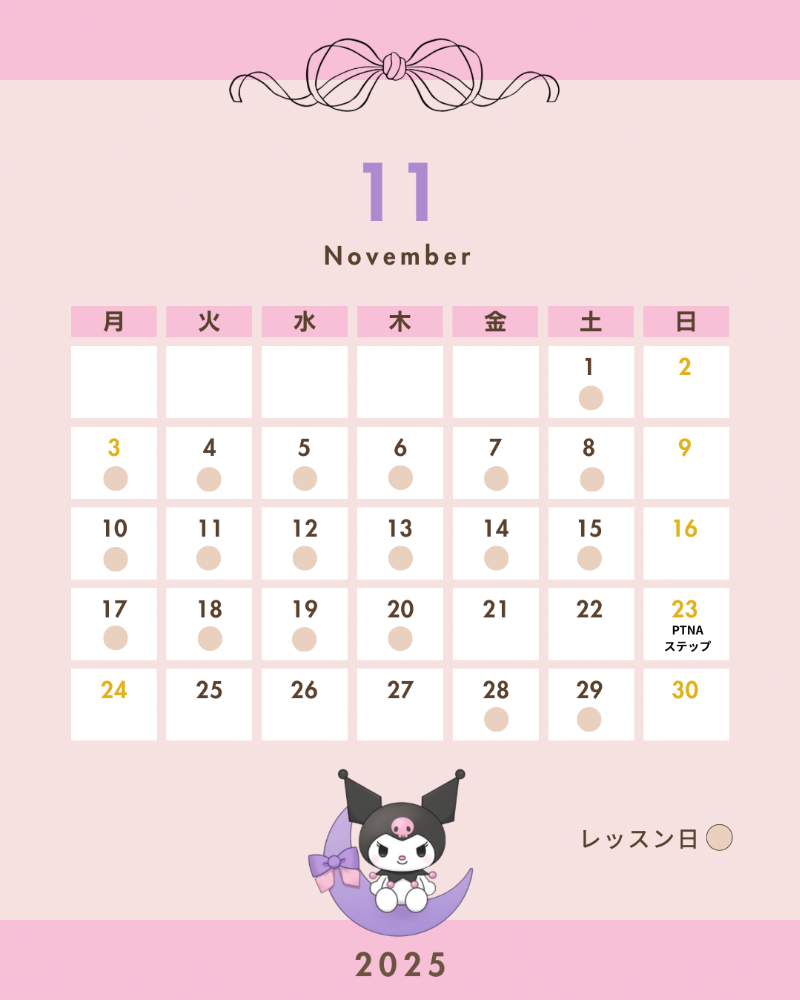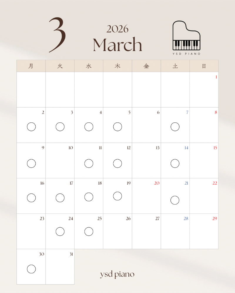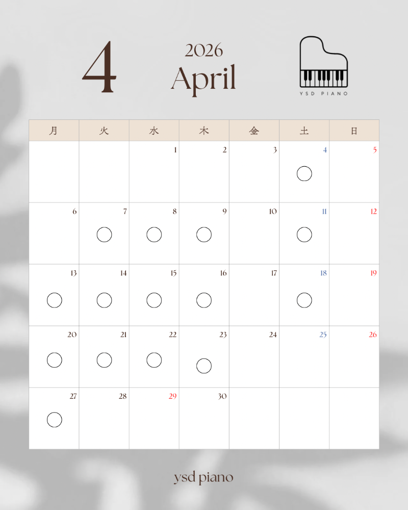 滋賀県守山市ピアノ教室 𝘆𝘀𝗱 𝗽𝗶𝗮𝗻𝗼 です○がレッスン日です。体験レッスンご希望の方もレッスン日の中からお選びください。